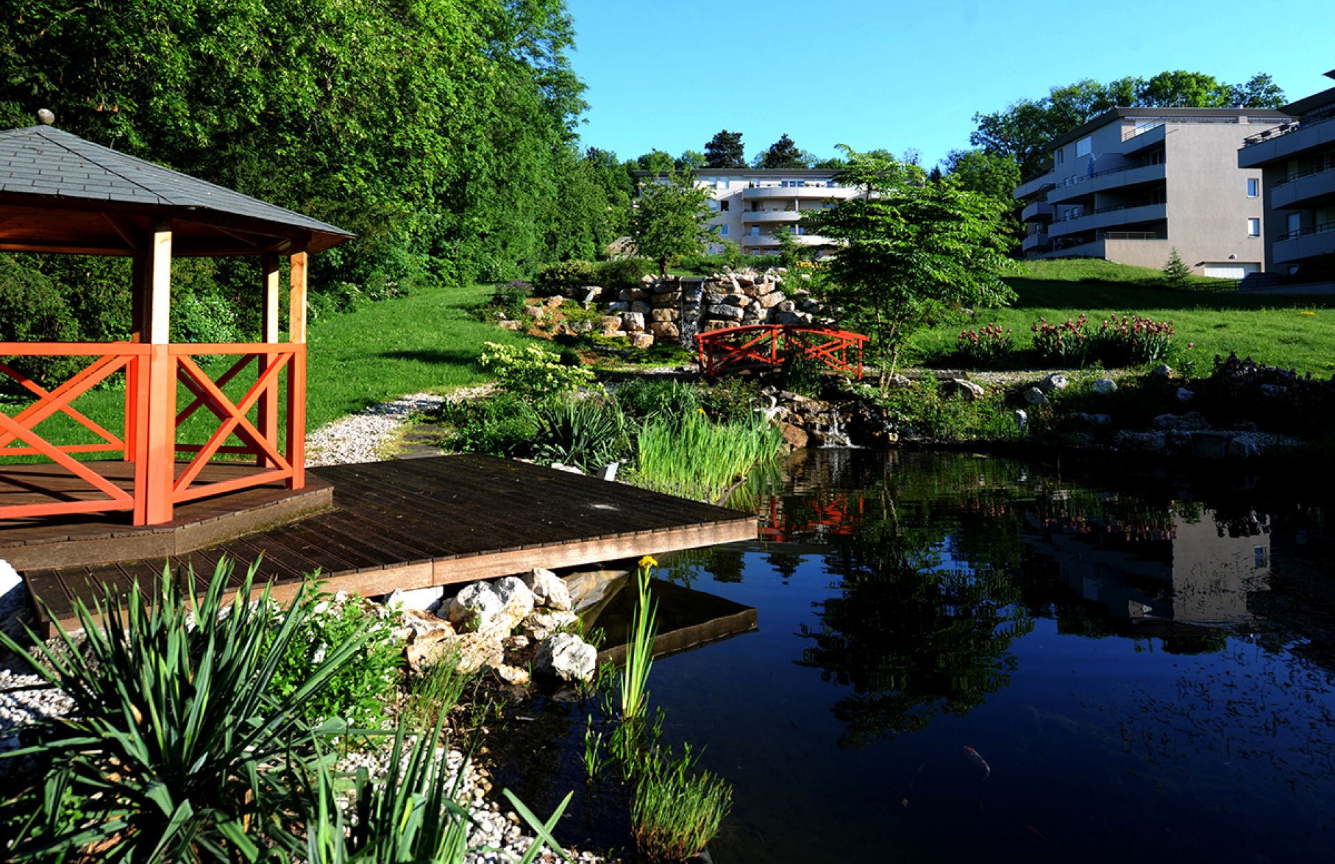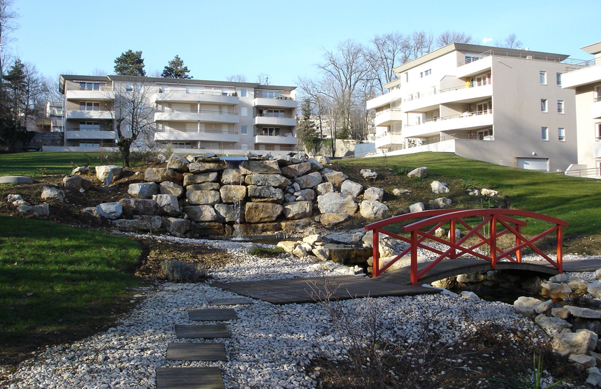 De petits immeubles au sein d'un ilôt de verdure et d'un grand parc arboré autour d'un exceptionnel bassin aquatique...
