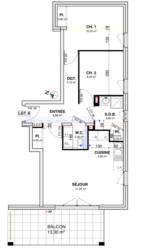 Dans la résidence de standing, calme et sécurisée "Via Rotonda", quartier Saint Claude,cet appartement de type 3 de 57.40m² se compose :