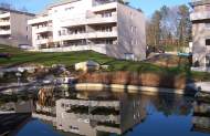De petits immeubles au sein d'un ilôt de verdure et d'un grand parc arboré autour d'un exceptionnel bassin aquatique...